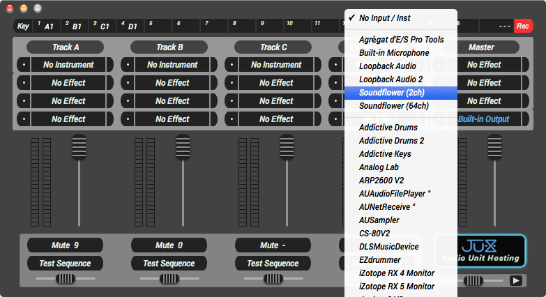 Le signal est maintenant dévié de votre sortie son et transite dans les canaux virtuels de SoundFlower (vous n’avez plus de son, c’est normal). Pour récupérer le signal dévié, ça se passe dans Hosting AU. Ouvrez le menu du haut de la Track D et choisissez « SoundFlower (2ch) ».