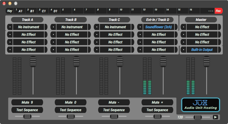 Pour arriver à ça, nous avons besoin d’un utilitaire supplémentaire, lui aussi gratuit. Il s’agit de Hosting AU. Ce logiciel est développé par Ju-x un développeur japonais. N’hésitez d’ailleurs pas à visiter son site (en anglais), il contient d’autres logiciels liés à la MAO (payants ou non) qui pourraient vous intéresser. Qualifié de micro DAW par son concepteur, il se présente comme ça.