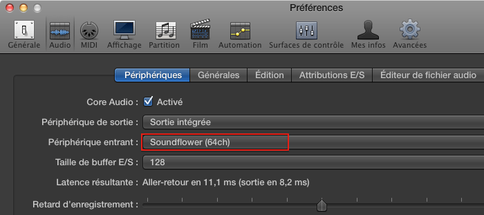 Dans le DAW qui va recevoir les pistes (ici Logic Pro X), je fais l’inverse, c’est à dire que SoundFlower est choisi en périphérique d’entrée.