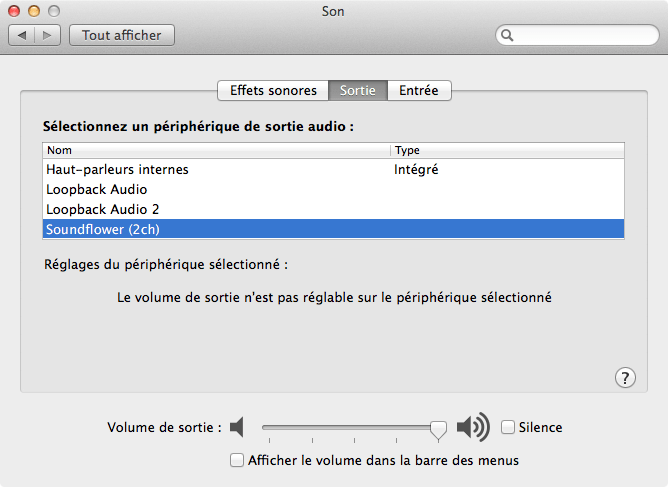 Ouvrez les « Préférences système » et l’onglet « Son ». Dans « Sortie », choisissez « SoundFlower (2ch) ».