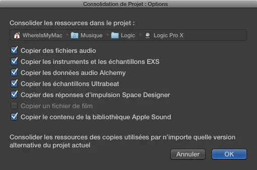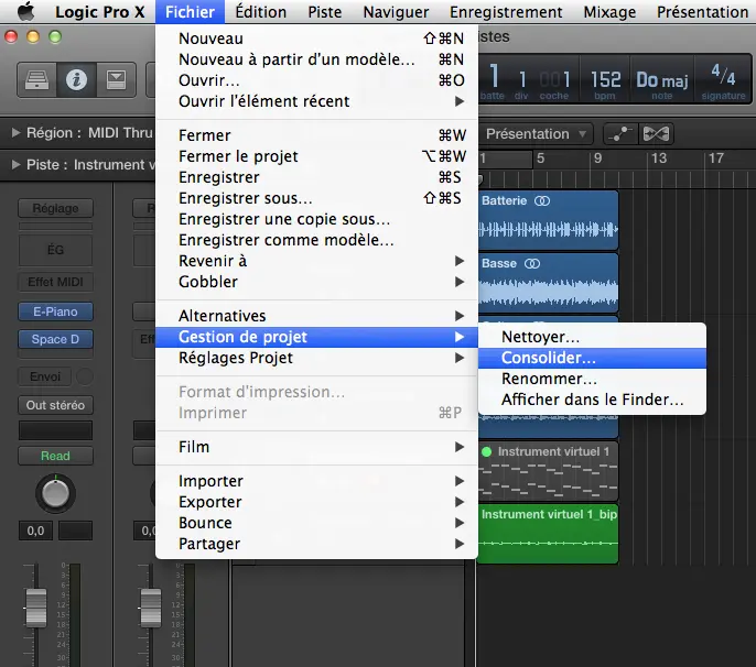 Avant toute chose, il est important de consolider le projet. Il arrive parfois que Logic utilise des samples/fichiers audio sans les copier au sein de la session en elle-même, ce qui fait qu’une fois dans nos stations de travail, il manquera des fichiers. Pour faire cette consolidation, il suffit d’aller dans le menu « Fichier » puis « Gestion de projet » et « Consolider ».