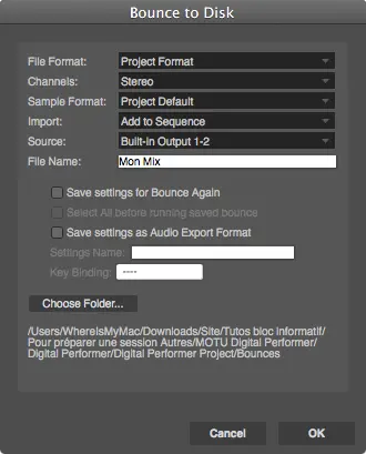 Allez dans le menu « File » et « Bounce to Disk » (Ctrl + J). Réglez les différents paramètres comme suit.