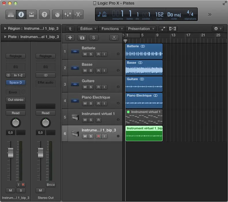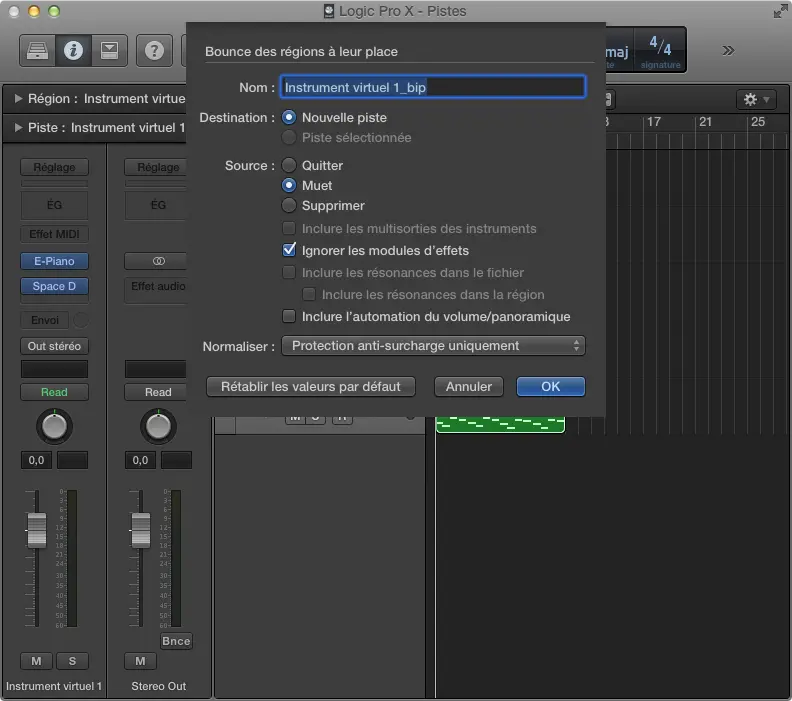 Si votre session ne comprend que des pistes audio, vous avez terminé. Vous pouvez passer directement à la section de fin. Si vous utilisez également des instruments virtuels tiers (autres que ceux contenus dans Logic), vous devez les bouncer en audio. Pour cela, il suffit de sélectionner chaque instrument (un à un) dans la fenêtre d’arrangement