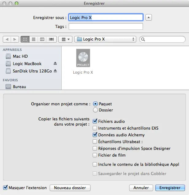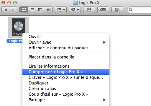 Dernière étape avant envoi, il va falloir les compresser au format zip. Avant de commencer, il est souhaitable d’enregistrer vos sessions Logic au format Paquet au lieu de dossier si ce n’est pas déjà le cas. il suffit d’aller dans le menu « Fichier » puis « Enregistrer sous … » et choisissez « Paquet ».